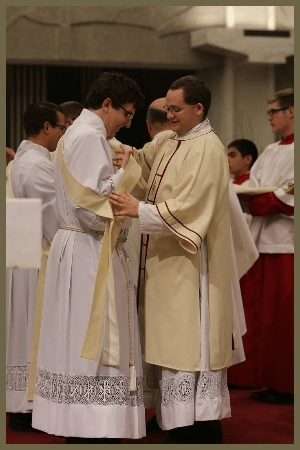 Finally, the Sacrament of Holy Orders also includes the ordination of deacons. They are situated at a lower level of the Church hierarchy. These candidates also receive the imposition of the bishop’s hands “not unto the priesthood, but unto the ministry” to serve the Church. Like the priest, the deacon is a co-worker with the bishop and the priest (CCC, 1569). Moreover, deacons also serve in Christ’s mission in a special way apart from the common priesthood of the faithful. “Among other tasks, it is the task of deacons to assist the bishop and priests in the celebration of the divine mysteries, above all the Eucharist, in the distribution of Holy Communion, in assisting at and blessing marriages, in the proclamation of the Gospel and preaching, in presiding over funerals, and in dedicating themselves to the various ministries of charity” (CCC, 1570).